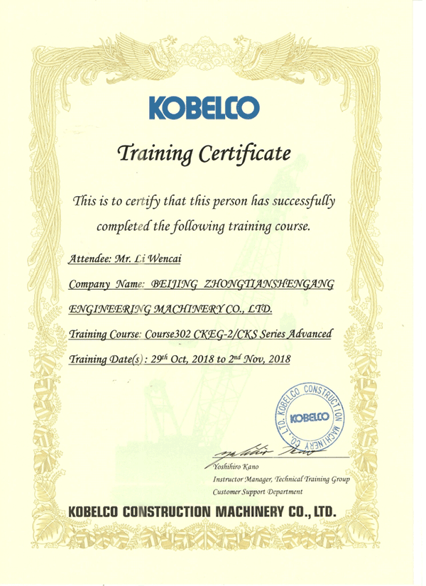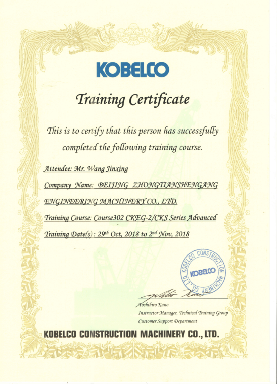 The service team of Beijing Zhongtian is consisted of experienced experts focusing on Japanese, Germany and American cranes for decades. We have successfully fulfilled hundreds of service projects in China or abroad, independent or co-operated with Kobelco engineers. All of our service specialist have accomplished the training in Kobelco Cranes in Japan and got the certification of Kobelco cranes.